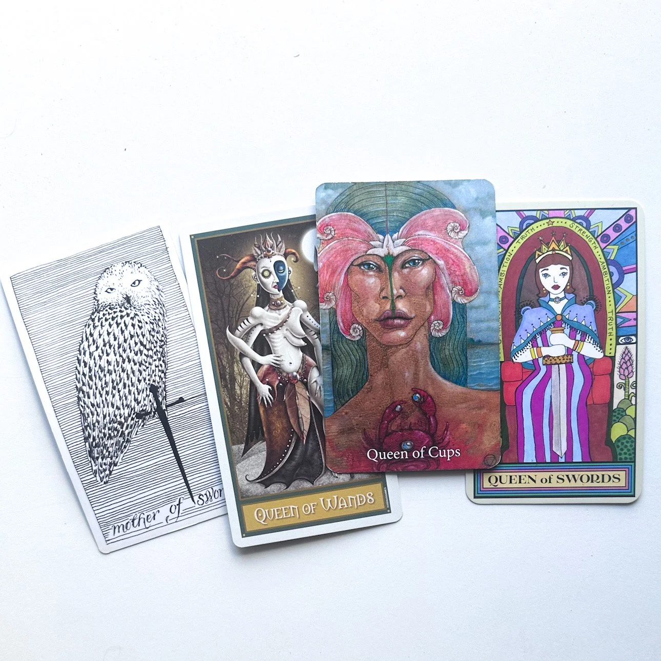 “Be the queen of your thoughts, not the slave.” I have this written in my own LWB and I think it every time I draw the Queen of Swords. She is forthright and honest. She speaks her mind and inspires others with her clear-sightedness — and wit. She knows how to command a room, but more than that, she knows how to command her thoughts. She can sometimes appear cold as she can compartmentalize her feelings and let her formidable intellect take the lead. Her frankness disarms all but her closest friends. This Queen is a philosopher, forever searching for a deeper meaning. What she lacks in empathy, she makes up for in her honesty. She will always give it to you straight. She teaches us to cut through confusion and find clarity in our thoughts. She encourages us to stop procrastinating, stop doubting ourselves, and finally commit to a project. She’ll inspire you to be crystal clear in your communications with others. Whether you’re debating a point, teaching a class, or planning a TED talk, the Queen of Swords is who you need to channel.